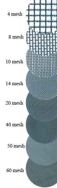 Figuring out mesh sizes is simple. The number of openings in one inch of screen is the mesh size. So a 4 mesh screen means there are four little squares across one linear inch of screen. A 100 mesh screen has 100 openings, and so on. Note, therefore that as the number describing the mesh size increases, the particle size decreases.